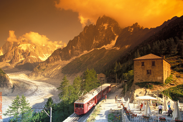 Chamonix, l'un des plus célèbres villages de montagne au pied du Mont-Blanc exceptionnel et majestueux, le plus haut sommet de l'Europe (4810 m. / 15,771 ft). Grâce à votre départ matinal, vous arriverez à Chamonix avant la foule. Avec vos billets pré-commandés, vous éviterez les longues files d'attente au téléphérique de l'Aiguille du midi grâce à notre cabine réservée. Vous êtes libre de passer votre déjeuner dans le village. Dans l'après-midi, vous prendez le célèbre train à crémaillère pour la Mer de glace.